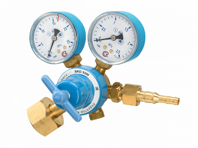 Редуктор кислородный БКО-50-12,5 с поверенными манометрами предназначен для понижения давления поступающего из баллона газа и автоматического поддержания постоянным заданного рабочего давления при газопламенной обработке и смежных процессах. Благодаря армированной мембране редуктор подходит для интенсивной эксплуатации в тяжёлых условиях. Изготовлен в соответствии с ГОСТ 13861-89.