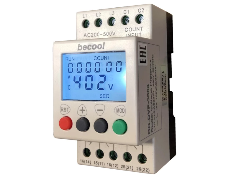 Реле контроля напряжения BC-DVP-3803 предназначено для защиты трёхфазных потребителей электрической энергии жизнеспособность которых, в значительной мере зависит от качества получаемого электропитания.