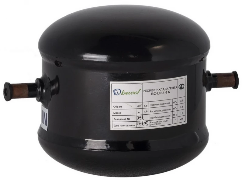 BC-LR-0,8 N - вертикальный ресивер жидкого хладагента стандартной серии N, от торговой марки Becool, объем ресивера 0,8 литр, рабочее давление 3,5 МПа, патрубок на входе под пайку 3/8", выход - под пайку 3/8". Смотровое стекло и выход под предохранительный клапан отсутствуют.
